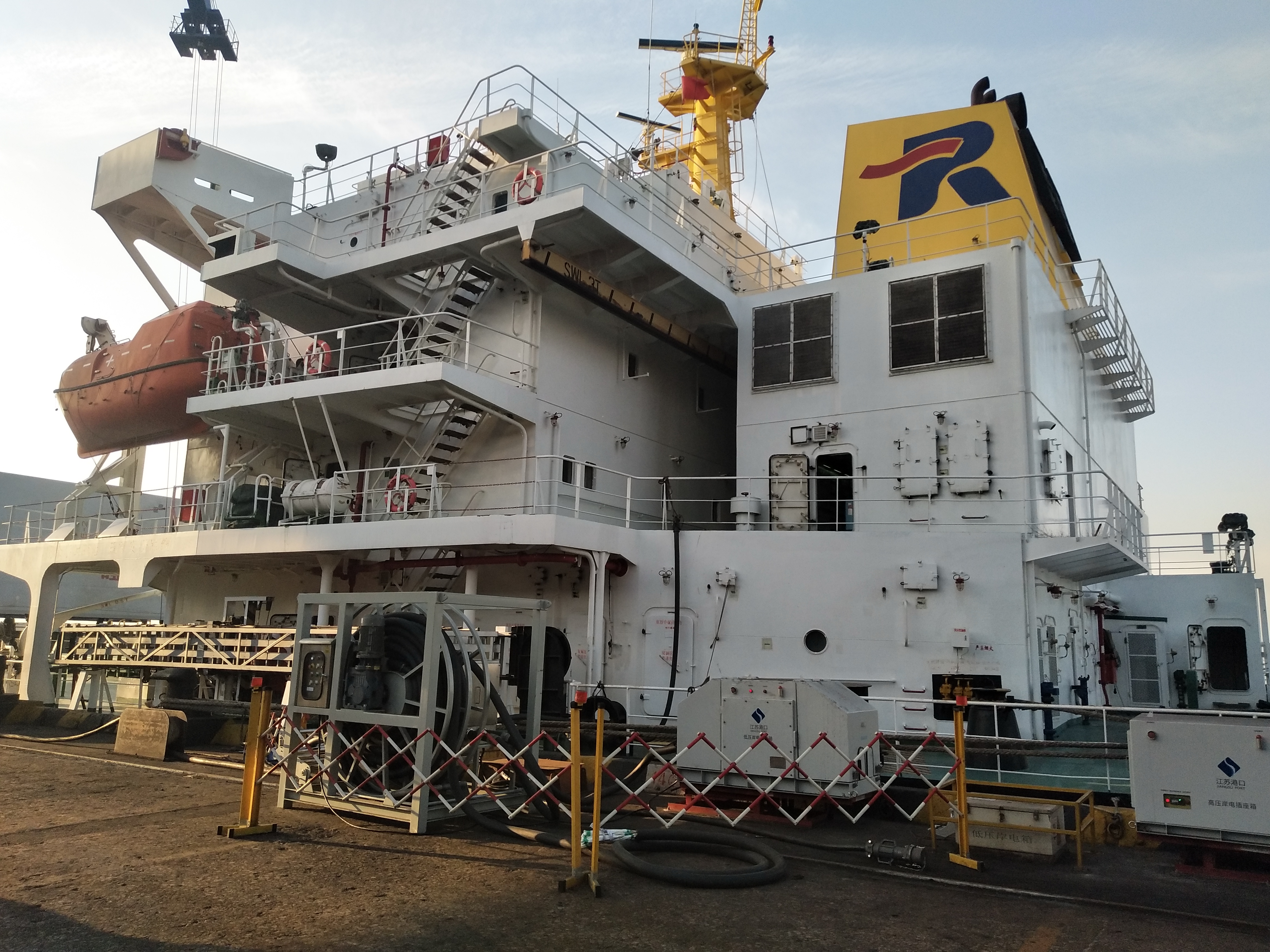 “長(zhǎng)春門”輪船載重51000噸,船舶發(fā)電機(jī)560kW,需在南京新生圩碼頭靠泊作業(yè)40小時(shí)。據(jù)測(cè)算,船舶岸電系統(tǒng)與“長(zhǎng)春門”輪于117日上午8點(diǎn)24分成功解列后,該輪靠港期間共使用岸電42小時(shí),消耗電能7000千瓦時(shí),可替代柴油2.5噸,減排二氧化碳近0.5噸。由此可見(jiàn),岸電系統(tǒng)的使用不僅減少了燃料的消耗,且大大降低了靠港期間的污染物排放量。